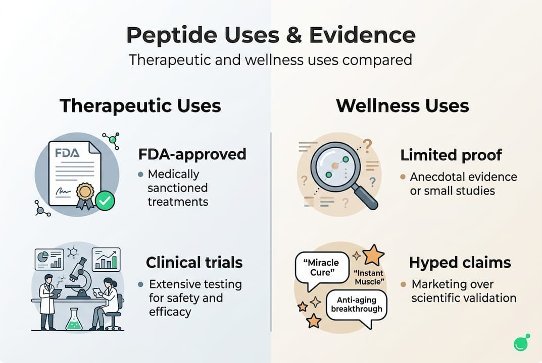 | Evidence varies by use | FDA-approved peptides have strong support, while many wellness peptides lack robust human studies. |